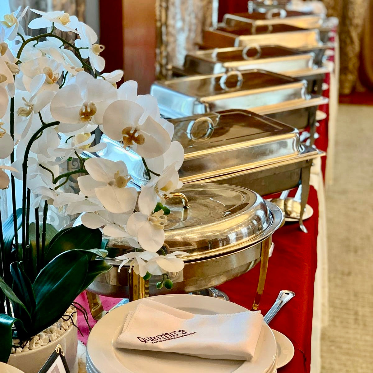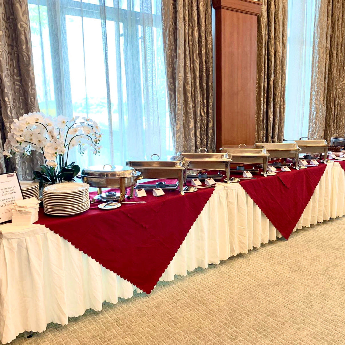 Menu comes with full buffet setup with buffet tables, table skirting, floral centerpiece and disposable tableware.